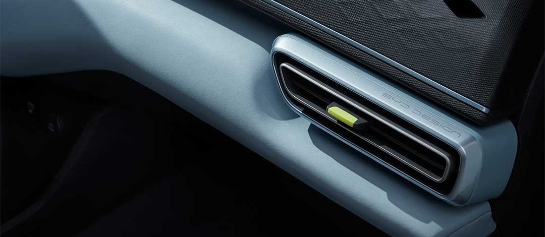 Ventilasi AC pada BYD Atto 1 menampilkan desain dengan garis-garis tegas dan aksen warna mencolok bergaya “cyberpunk”, yang memberikan kesan futuristik dan dinamis dalam interior kabin.